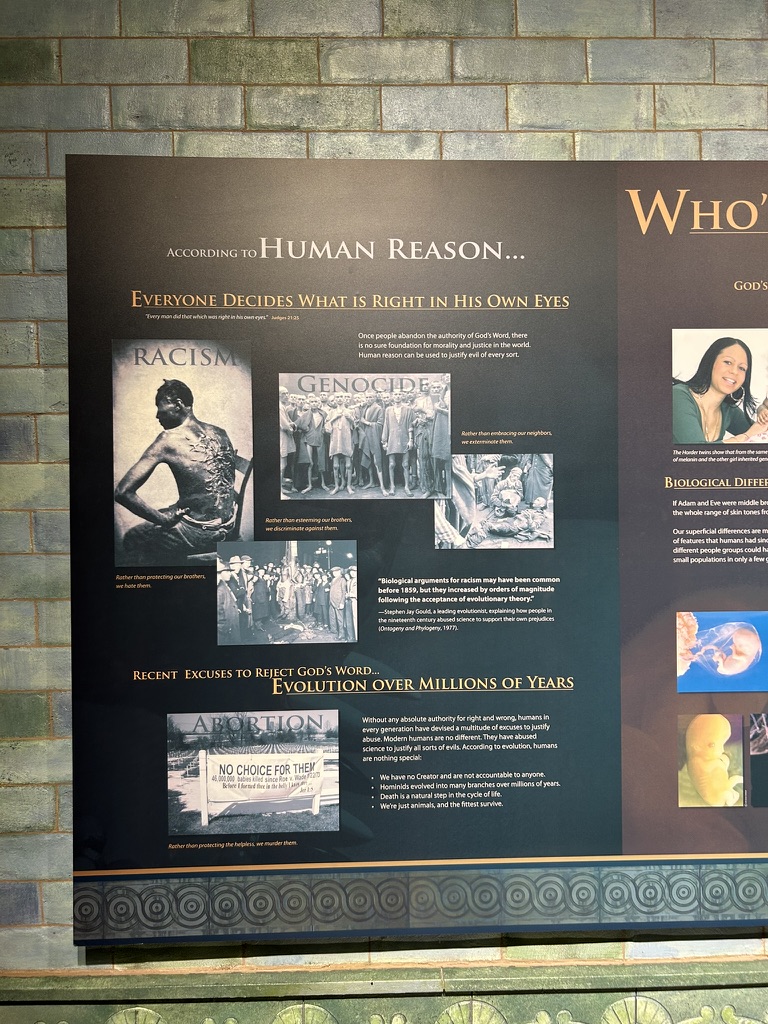 I won’t argue with all of the points that the museum makes about evolutionary theory. Indeed, many nineteenth- and twentieth-century thinkers saw the theory of evolution as confirmation of white supremacy. The field of anthropology was so rife with scientific racism that Franz Boas chose to dedicate an entire book to its debunking (I’m supposed to be reading it for one of my classes). It goes without saying, however, that the museum’s tone-deaf invocation of historical and contemporary racism only appears where it can be used to discredit evolution and support a literal reading of the Bible. Exhibits instrumentalize narratives of human suffering before turning our attention to ecclesiastical concerns. Like I mentioned before, the Creation Museum doesn’t provide proof for creationism so much as it cultivates doubt about the veracity of evolution and science more broadly.