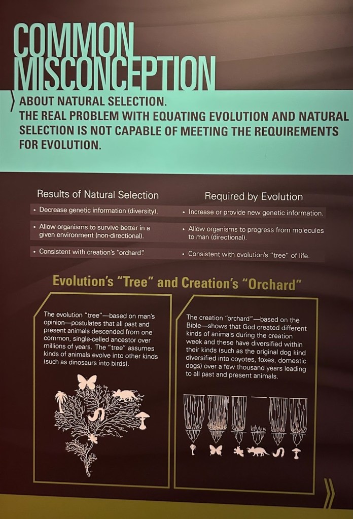 The museum’s explanations were, nevertheless, entertaining to read. Questions that come to mind (and questions that don’t) are swiftly and faithfully answered. What about radiometric dating? It has been known to “miserably fail,” one panel tells us. Doesn’t fossil evidence like Lucy suggest that hominids have evolved over time? No, Lucy was an ape who belonged to an “ape kind.” What about the fossils of other extinct creatures? They were animals that perished during the Great Flood around 4,400 years ago and in no way discredit creationism. But how on earth did Noah fit two of each extant species on the Ark? He didn’t; he took two of each “kind” of animal, which (upon leaving the Ark) reproduced and “generated” all the species we know today. Isn’t that evolution? No, it’s natural selection, which is different.