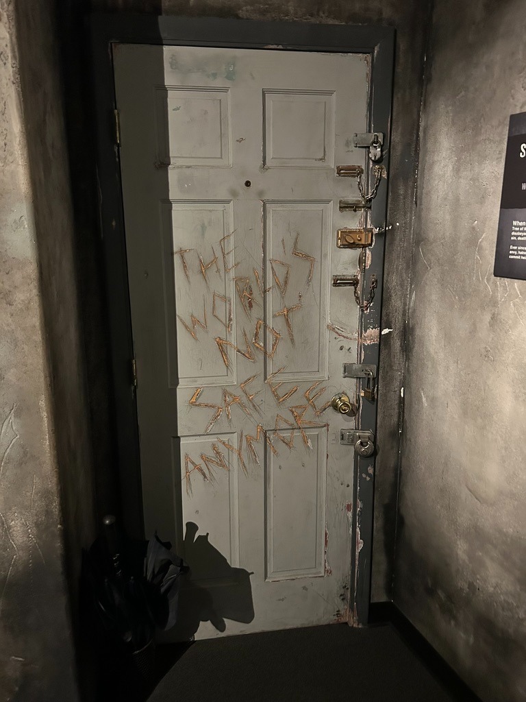 My least favorite part of the museum was the Cave of Sorrows. It comes just after the second of the “7 Cs in God’s Eternal Plan,” Corruption. If anyone cares, the complete sequence is as follows: Creation → Corruption → Catastrophe → Confusion → Christ → Cross → Consummation. Anyway, after we learn that Adam disobeyed God and thence begot all human suffering, the tone shifts dramatically. We enter what appears to be a doomsday bunker, complete with imitation concrete walls, dingy lighting, and a beat-up door with seven locks reading “THE WORLD’S NOT SAFE ANYMORE.” An arresting image of two emaciated men in a concentration camp confronts the viewer. This is the first time the museum directly references contemporary history. The image is flanked by a photograph of a child hugging a tombstone and another of a row of human skulls. The text above reads, “…through one man [Adam] sin entered the world […]”